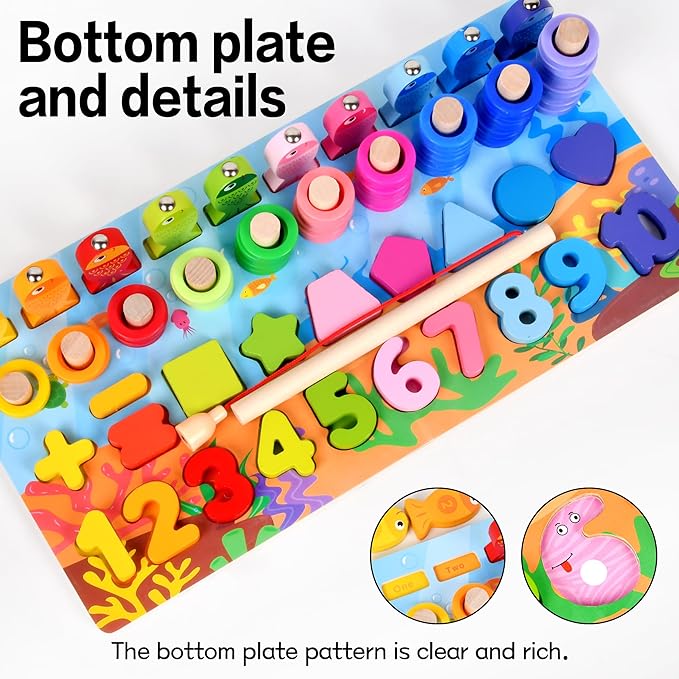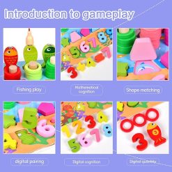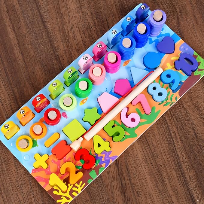A fun and interactive wooden toy that helps children explore numbers, shapes, colors, and more — all in one engaging set! Perfect for both playtime and early education.