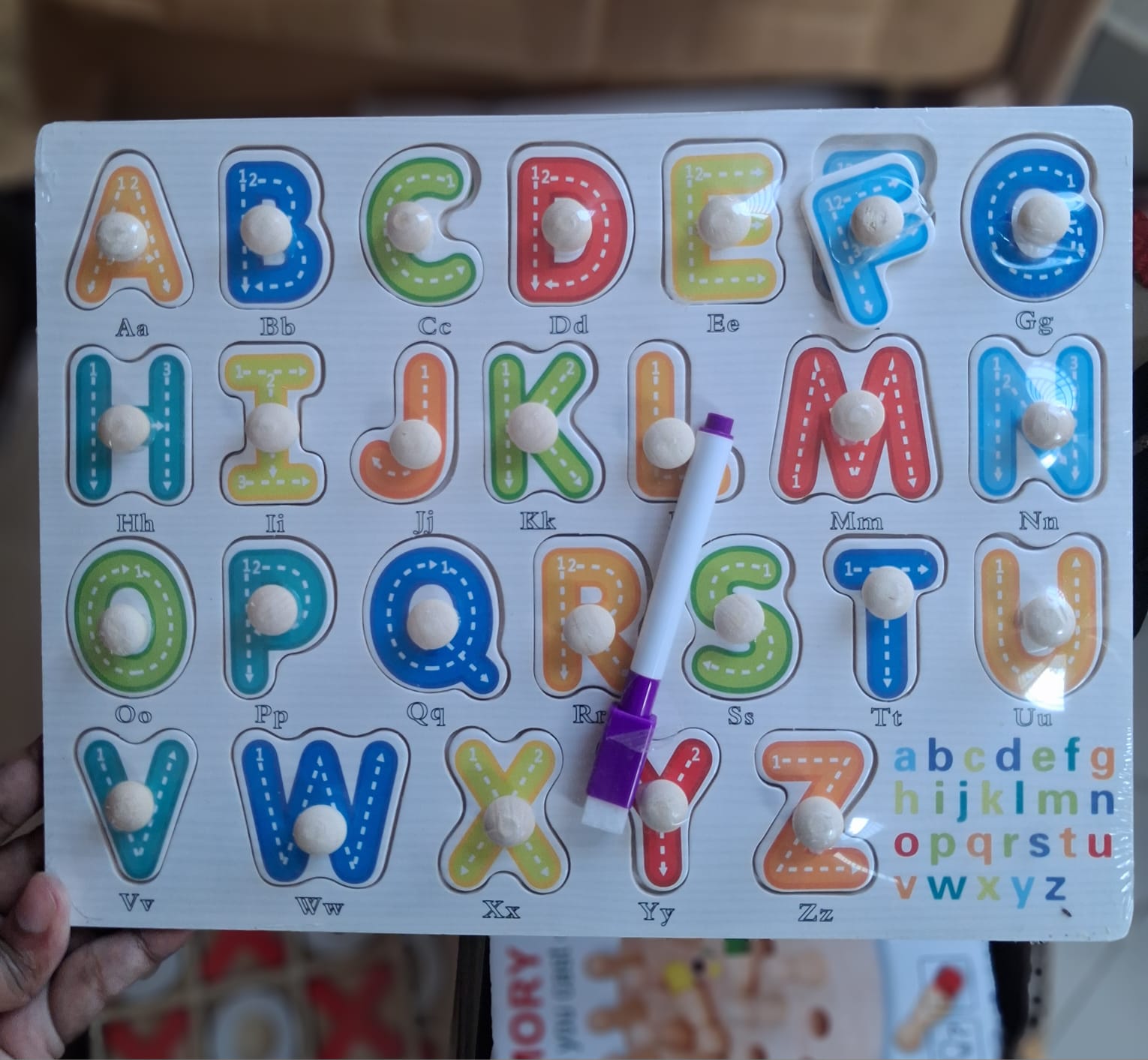 শিশুদের জন্য তৈরি এই রঙিন কাঠের অ্যালফাবেট পেগ পাজল বোর্ড শেখা এবং খেলার আদর্শ সমন্বয়। প্রতিটি অক্ষরের ওপর রয়েছে সহজে ধরার মতো কাঠের পেগ, যা ছোট হাতের জন্য একদম পারফেক্ট।